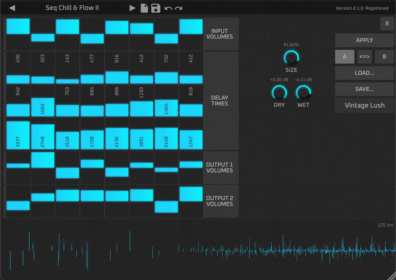 By default, the plug-in has various carefully tuned delay settings pre-installed. However, it also allows you to create your own delay/reverb templates, which can then be used in the presets. A complex network between the delay lines ensures that the delays do not have to be perfectly adjusted to sound good.