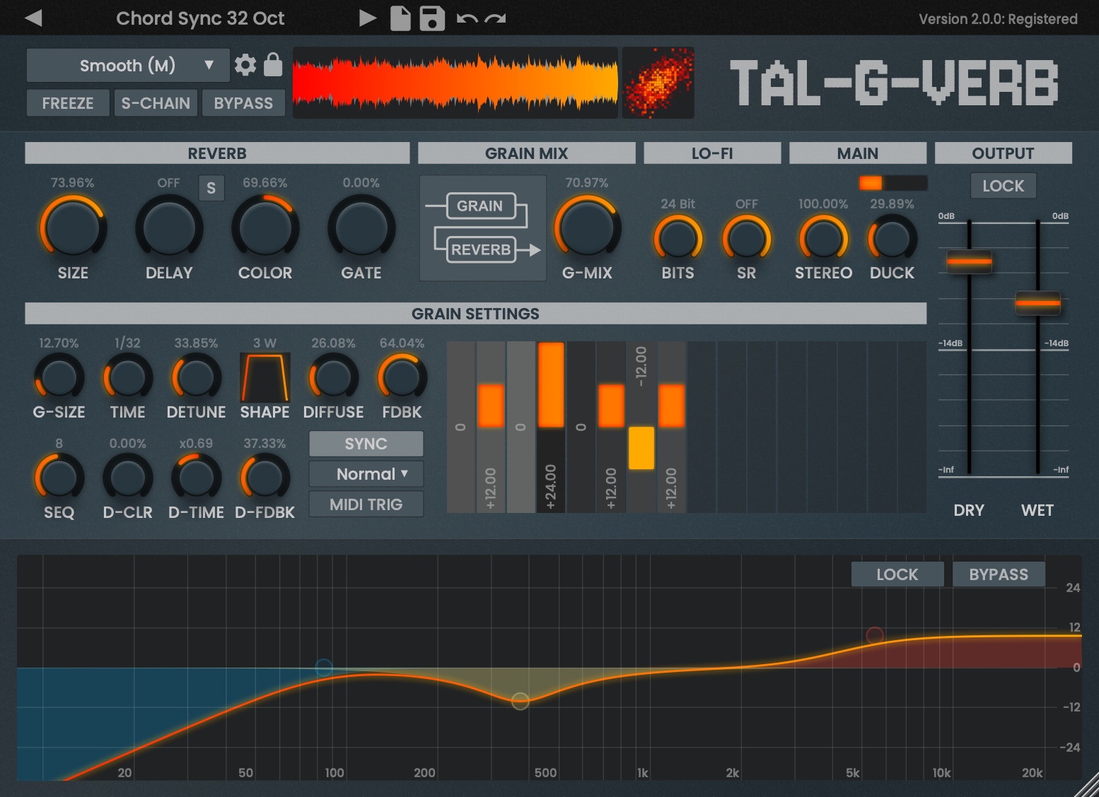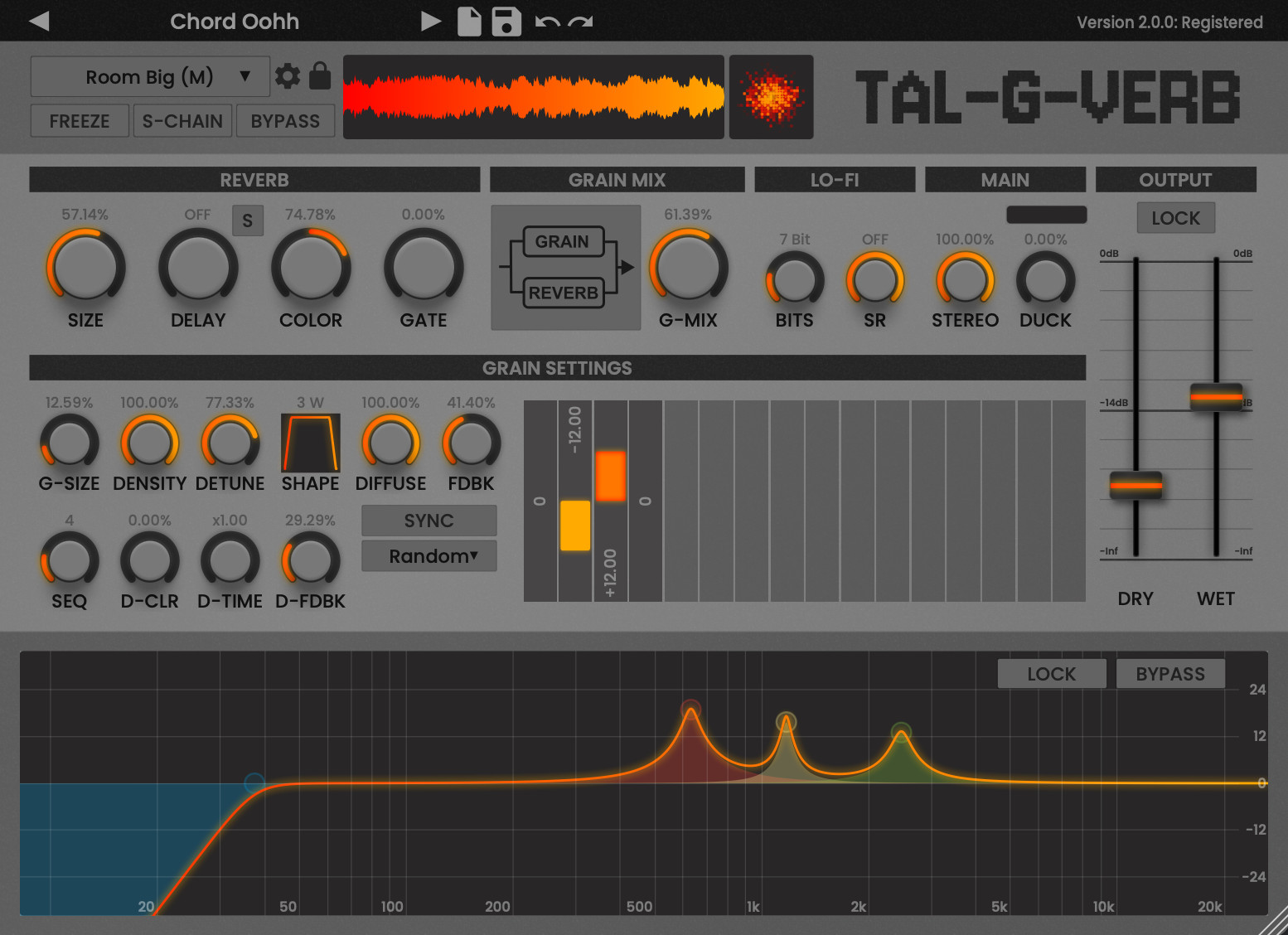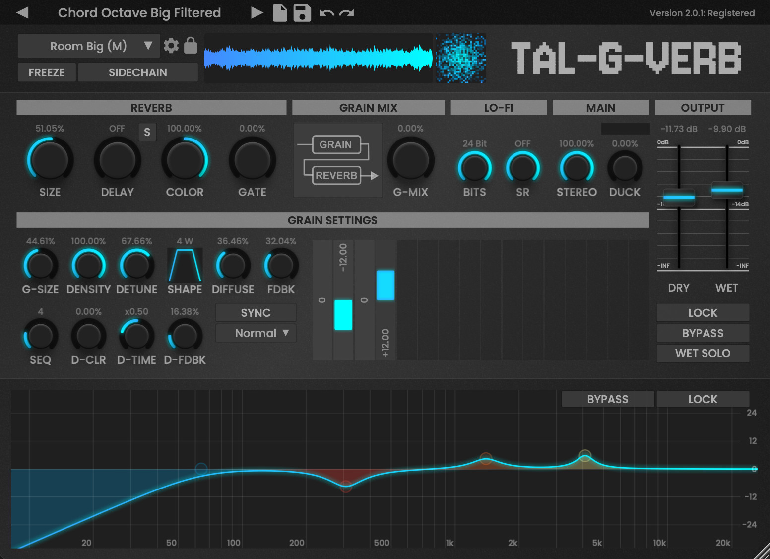 The included graphic EQ can be used to shape the output spectrum of the reverb. A single color control determines how much the reverb is modulated. No color results in a crystal clear reverb, a large amount of color results in a broader and more diffuse reverb sound.